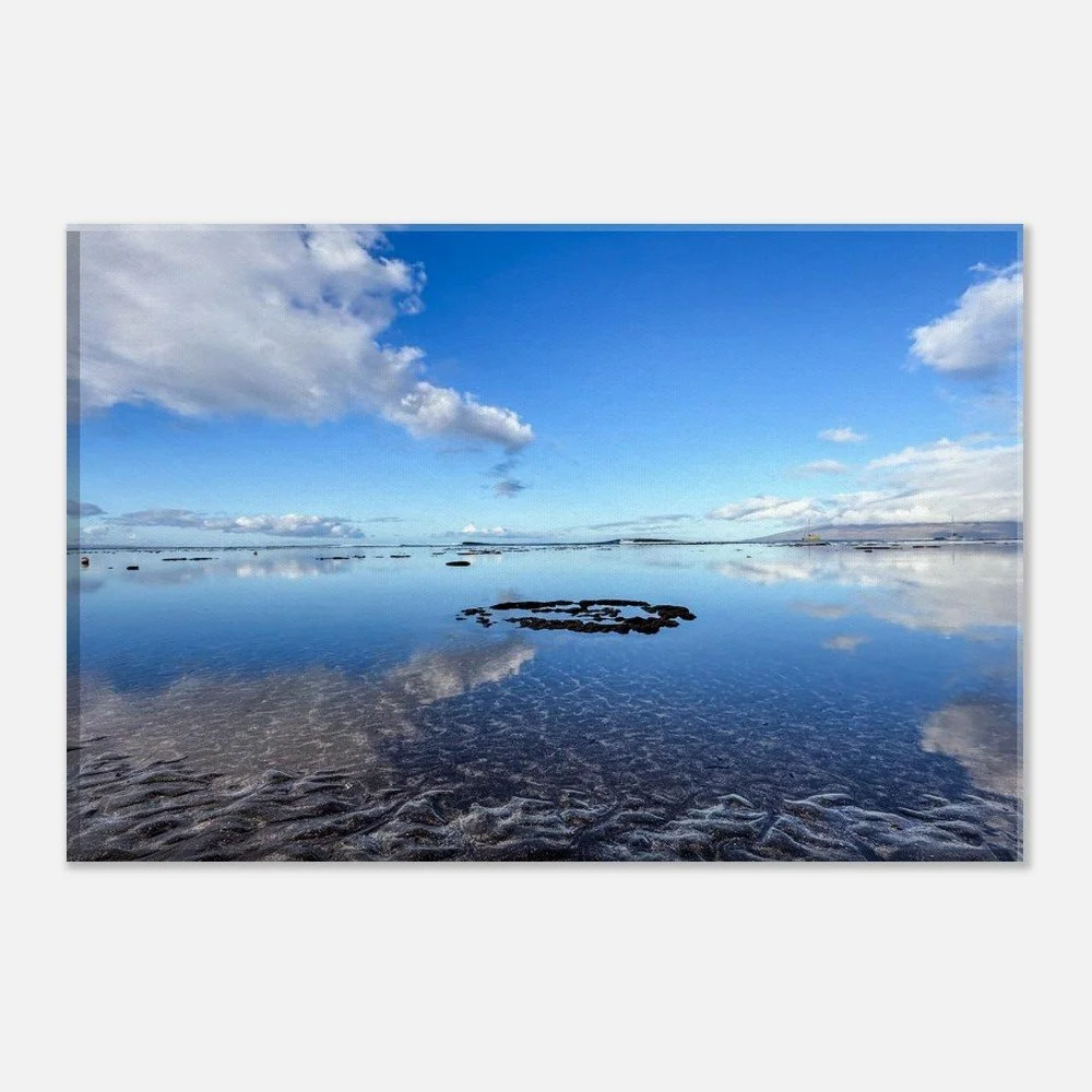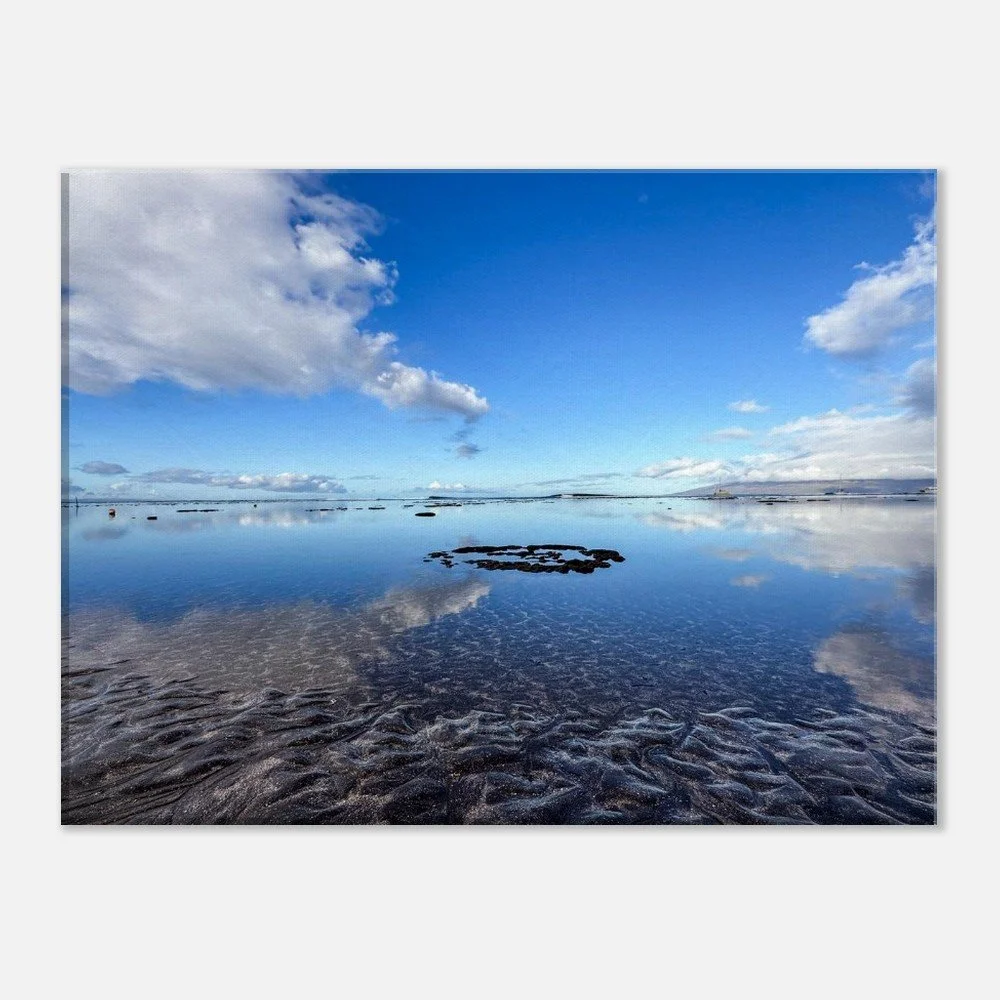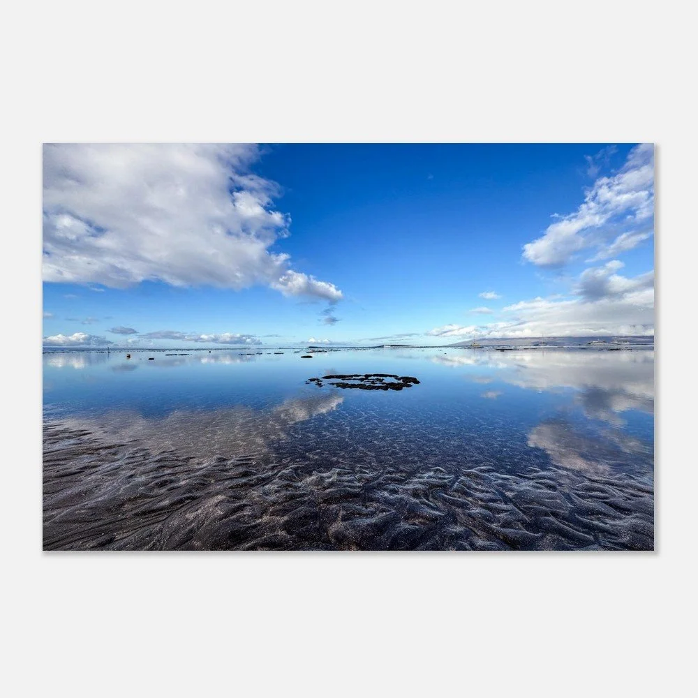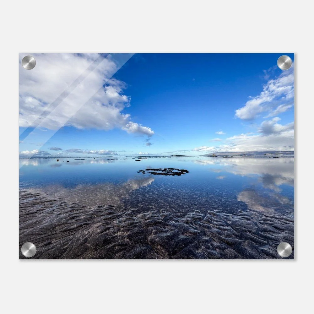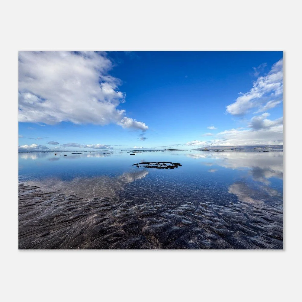On this morning beach walk, the wind and the waves were so calm as to make glass of the ocean surface. The sand and coral peeking out of the ocean offer contrasting textures. It was a dreamy early Maui morning scene. - Jean Marie Johnson